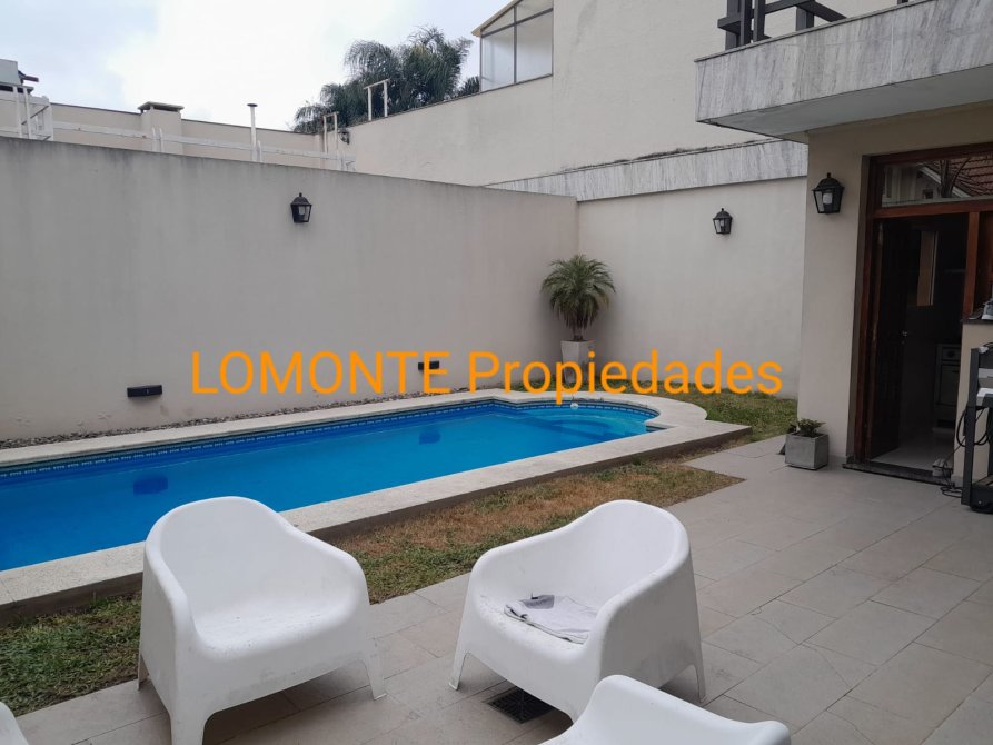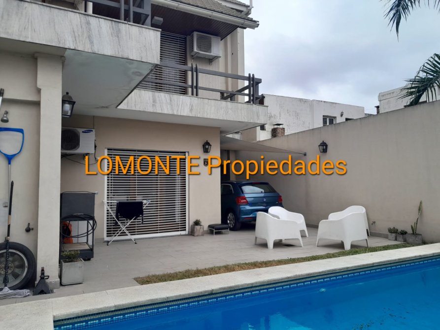 Inobjetable CHALET DE 5 AMB. con jardín, entrada de recepción, amplio living en concepto abierto al comedor diario y cocina amoblada en altos y bajo mesada con horno y anafe, toilette, lavadero aparte, dormitorio principal en suite con amplio baño compartimentado y salida a balcón aterrazado, 2 dormitorios con placares completos uno de ellos con balcón aterrazado, baño completo, hall de distrib. con placard, acceso al playroom y baulera. Garage pasante para vs. vehículos portón automatizado. Área verde con césped, baldosones y piscina de 7 mts. por 3 mts. con equipamiento completo, Sólida construcción con materiales de primera calidad, ventanales con persianas de aluminio con sistema barrio, porcelanatos, escaleras en mármol con barandas de madera y vidrios templados, mesadas silestone, equipos t/split, destacada línea de herrajes, trabajos de yesería. Exc. orientación, luminosidad, distrib. y funcionalidad de ambientes.